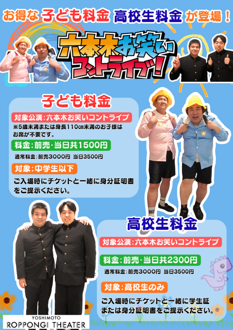 土日祝に開催の『六本木お笑いコントライブ』に【子ども料金】【高校生料金】が4月から新登場!!
