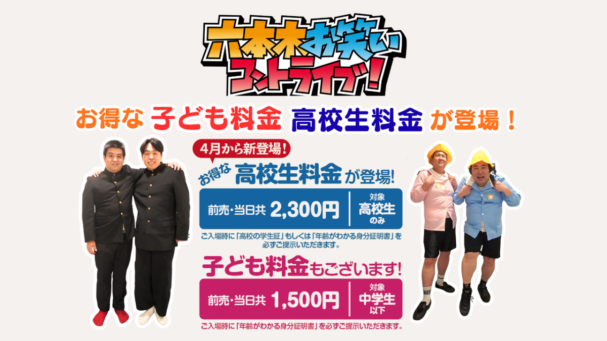★☆土日祝に開催の『六本木お笑いコントライブ』に【子ども料金】【高校生料金】が4月から新登場!☆★