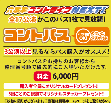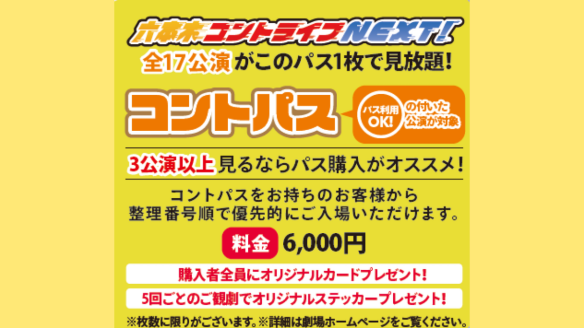 6月に開催する「六本木コントライブNEXT!」の 全17公演を6000円で見れちゃうフリーパスチケット!